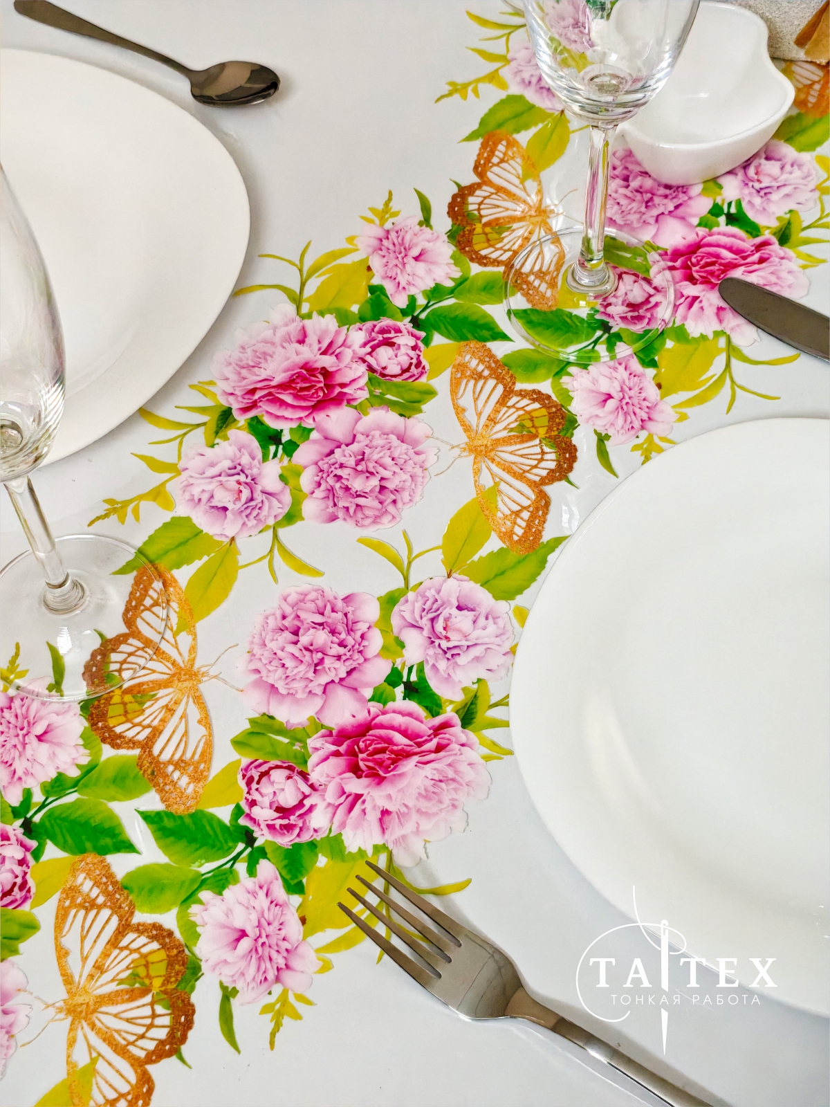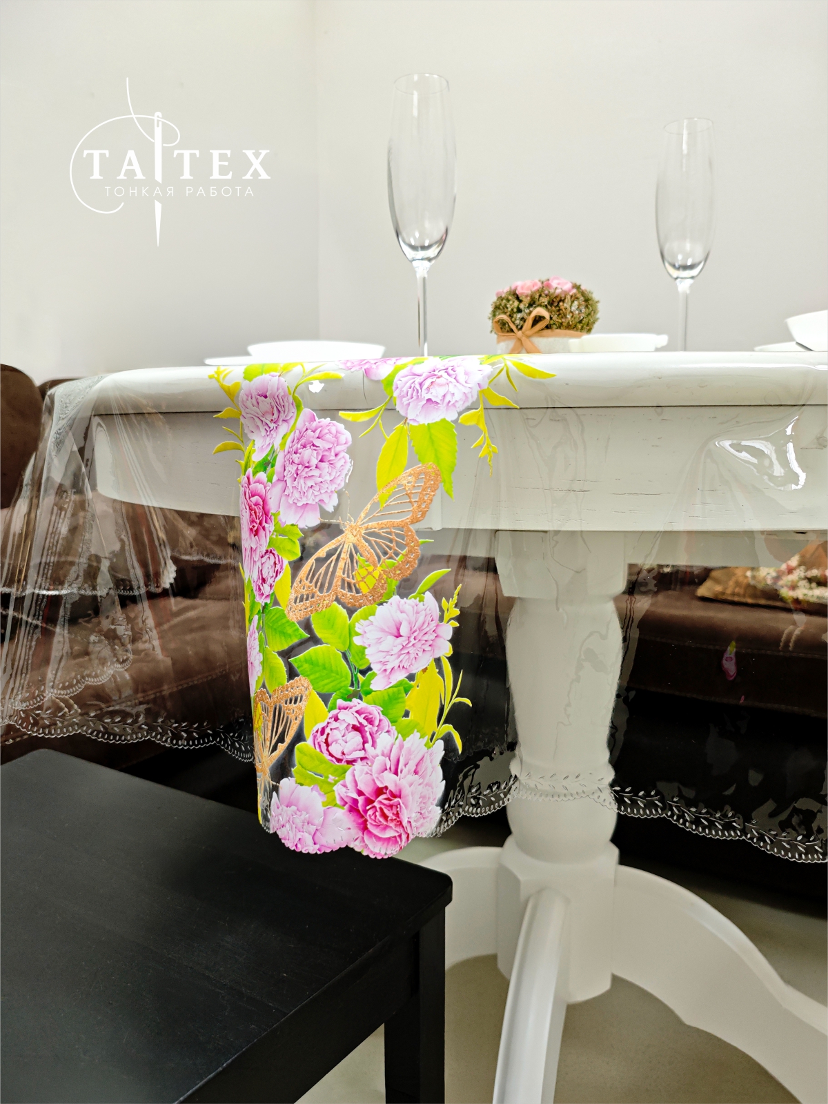 Гибкое стекло, скатерть прозрачная с пробивной каймой 110х110 см (круг), толщина 0,4 мм ПЕЧАТЬ flow